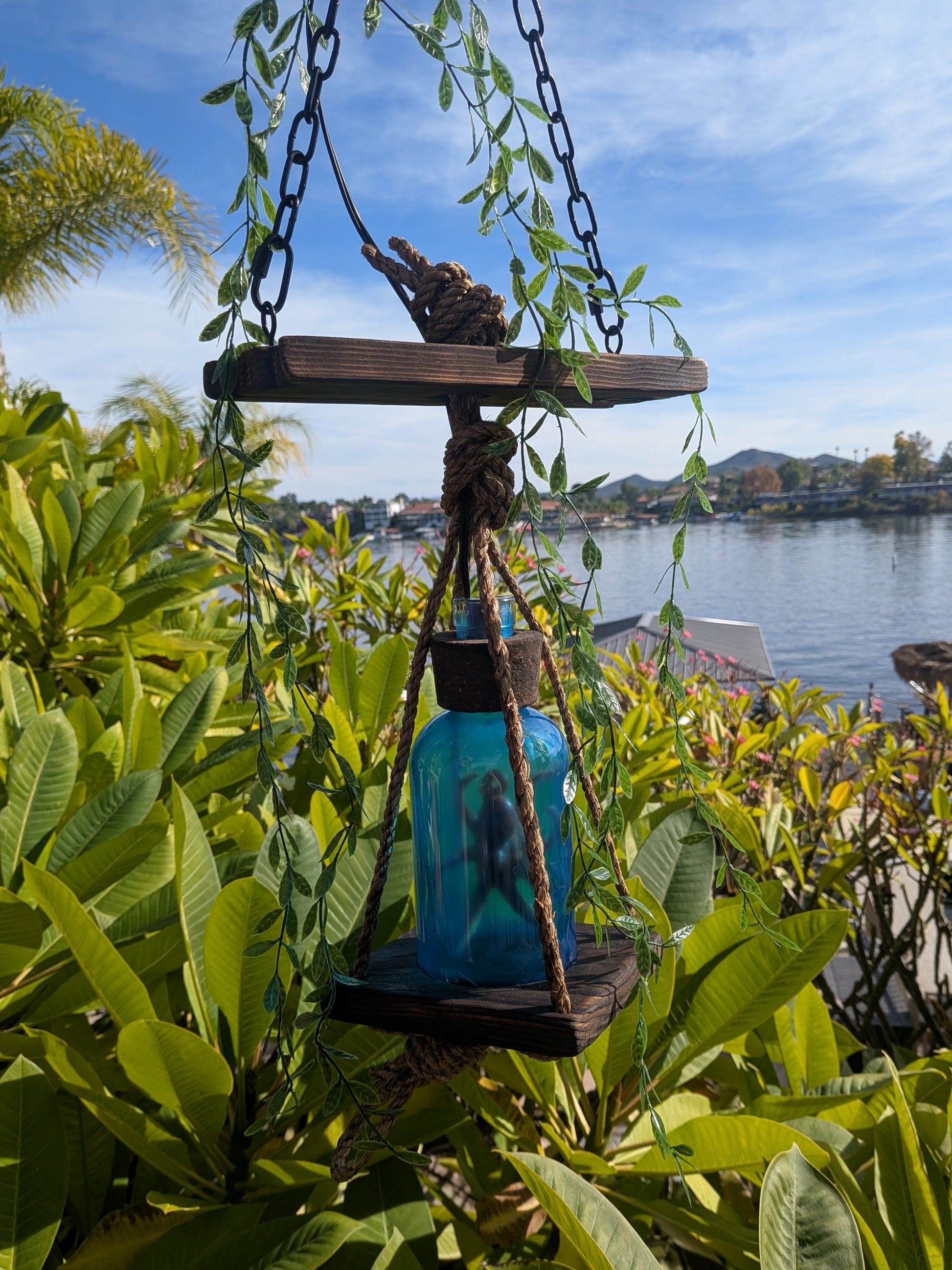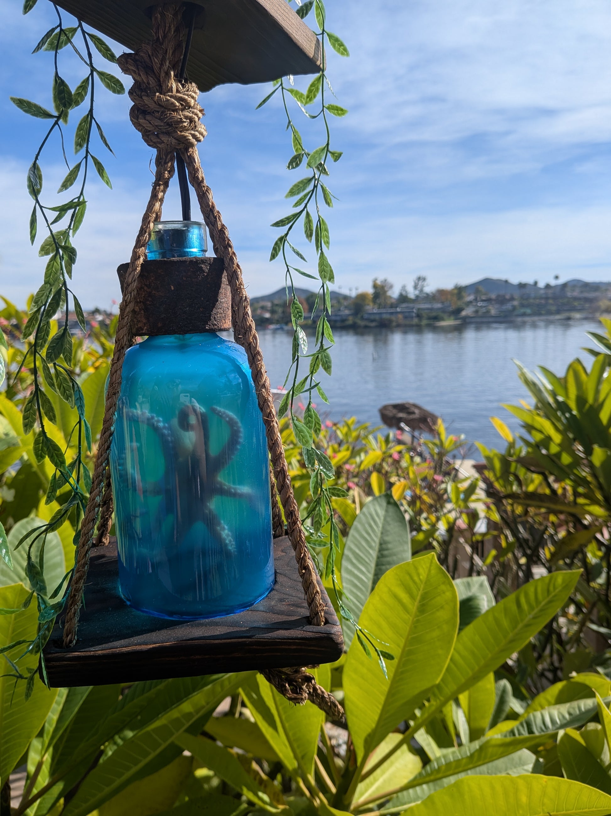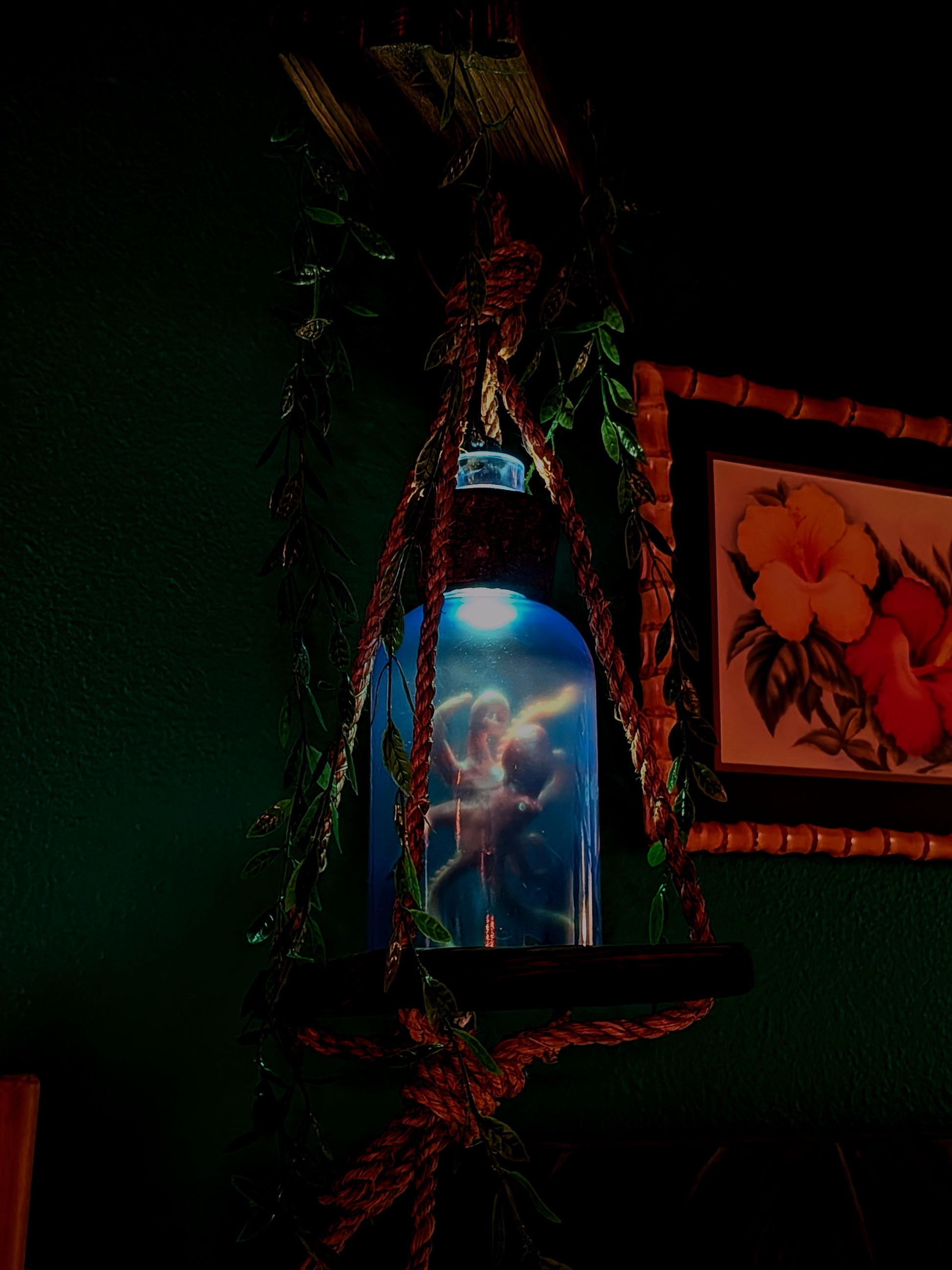 *Creature Feature tiki lamps are roughly 26" from the top of the hanging chain to the bottom rope loop. The wooden base that the Creature's bottle sits on is 6" square.