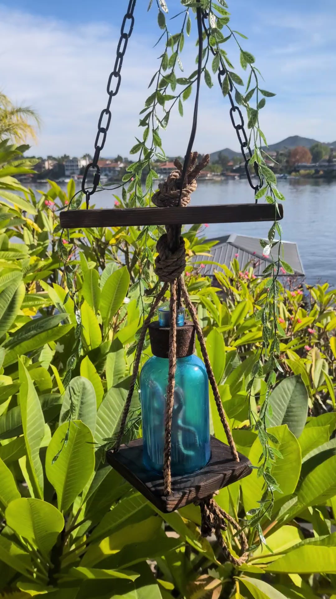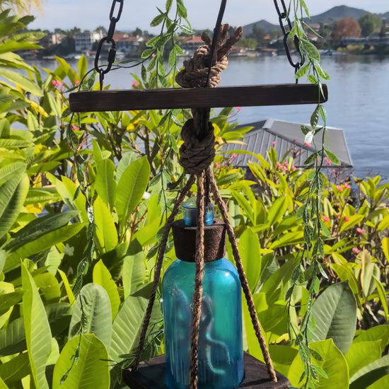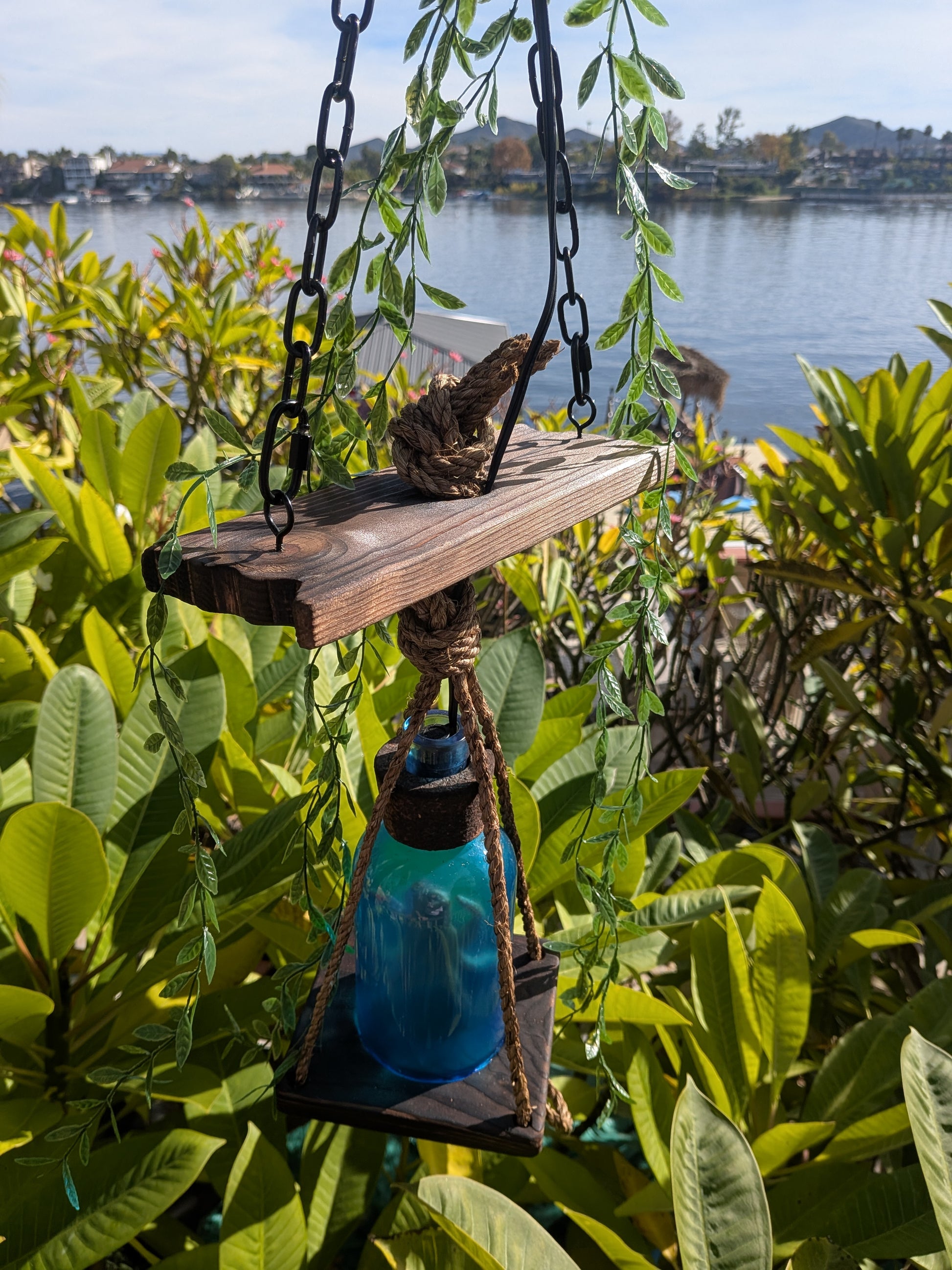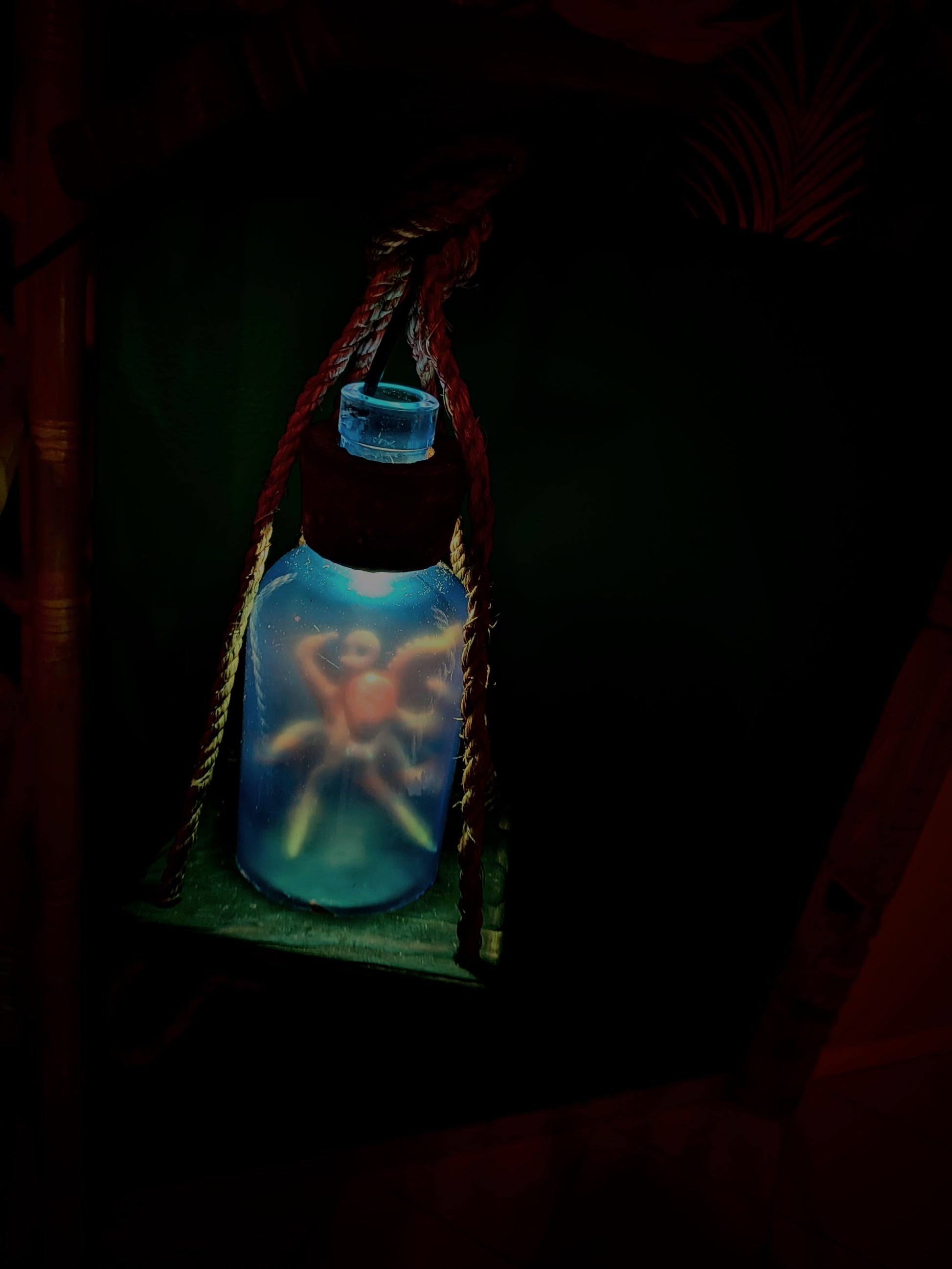 *Creature Feature tiki lamps are roughly 26" from the top of the hanging chain to the bottom rope loop. The wooden base that the Creature's bottle sits on is 6" square.