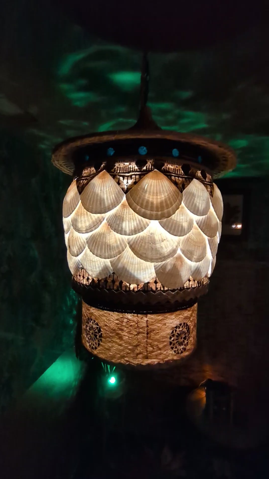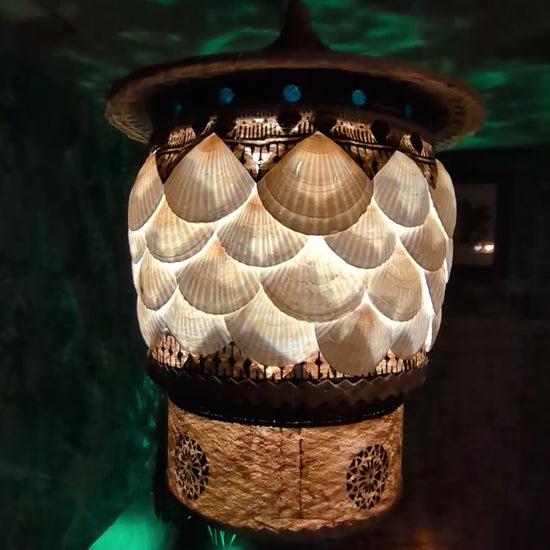 If you are looking for centerpiece to your tiki bar, look no further. This stunning shell lamp features vintage tapa, maplewood inlays, peep-through resin windows, and a vibrant turquoise cowrie shell bottom lens.