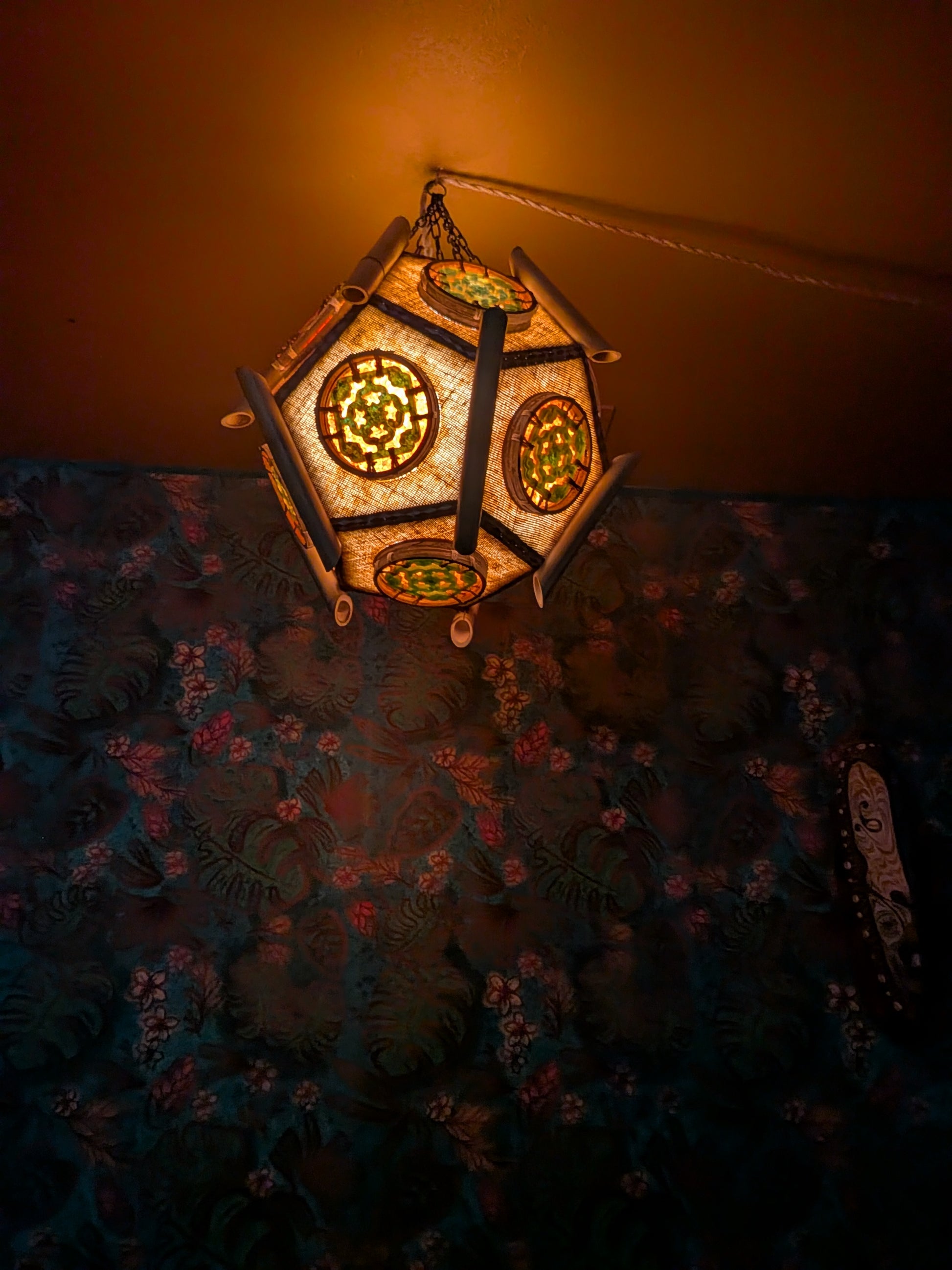 If you are looking for centerpiece to your tiki bar, look no further. Transparent jade resin tiles contrast beautifully with blood orange crushed glass windows. Each dodecahedron panel lets light shine through and the entire lamp gives off an ethereal glow.
